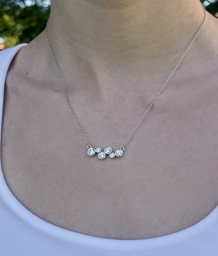 Dazzling cubic zirconia gemstones are arranged like bubbles on this delightful bar necklace. Chain is included. Read more