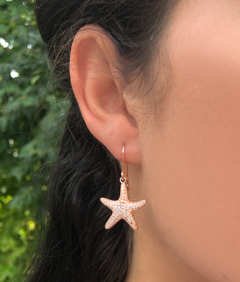 Our sterling silver Pavé Rose Gold Starfish Earrings pack a sparkly punch! Covered in faceted cubic zirconia stones that catch the light from every angle, these glittering starfish earrings hang from French ear wires.