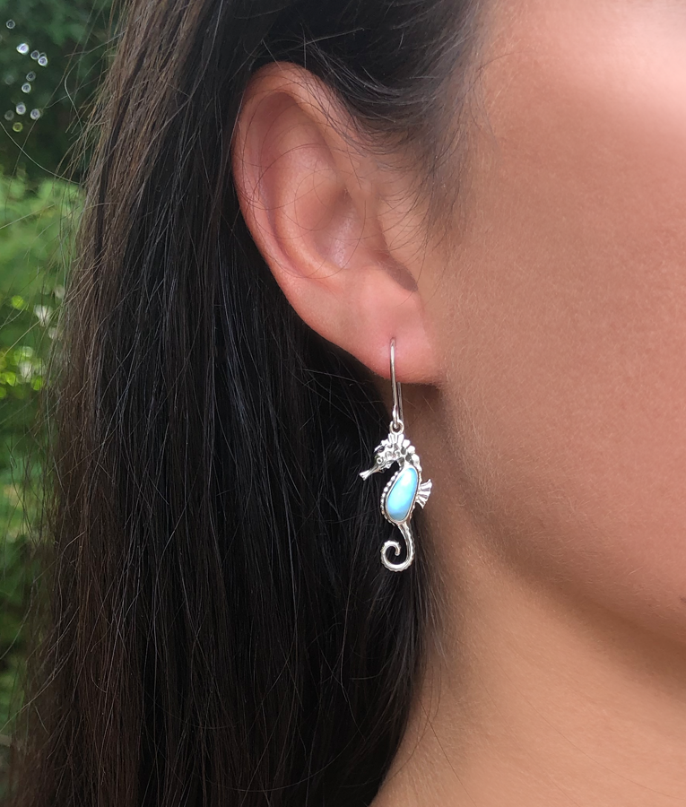 Sterling silver seahorse earrings with larimar on French ear wires. Our sterling silver Larimar Seahorse Earrings are a beautifully detailed... Read more